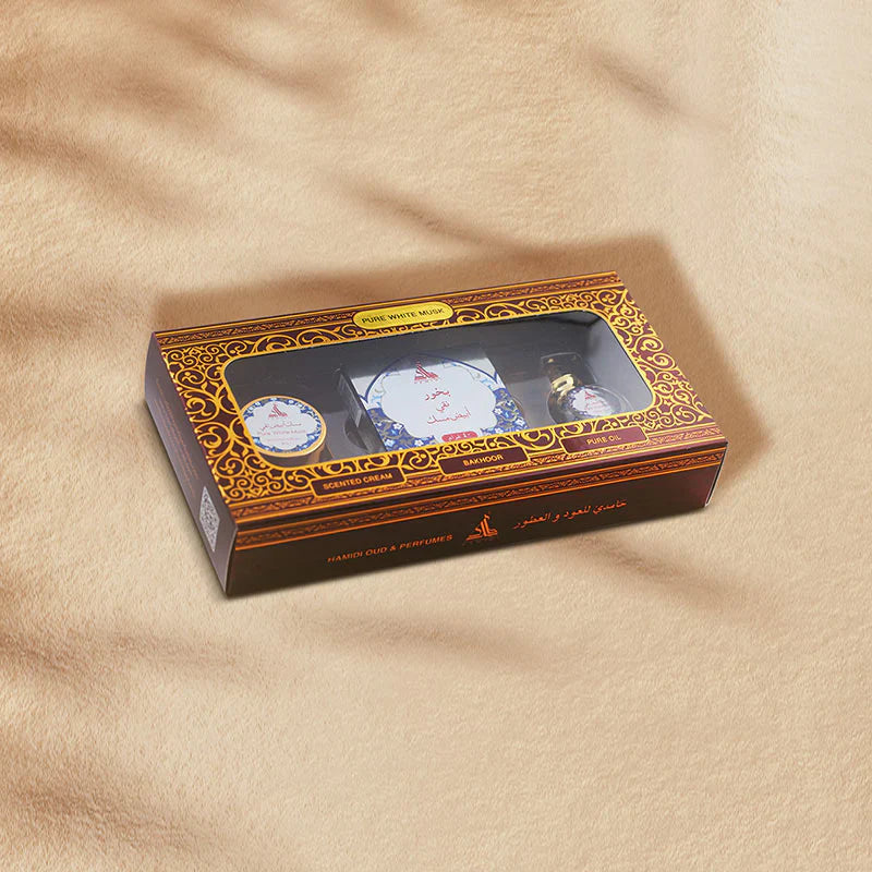 Embrace the subtle elegance of the Pure White Musk Scented Cream 8gm, Bakhoor 40gm, CPO 15ml 3-Piece Gift Set. This set combines a soothing scented cream, aromatic bakhoor, and concentrated perfume oil (CPO) to offer a gentle, long-lasting fragrance experience. White musk's clean, soft notes create an atmosphere of serenity, making this set perfect for relaxation or daily use. Ideal for gifting or treating yourself, this luxurious fragrance collection is sure to leave a lasting impression.
